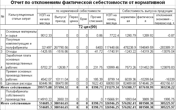 Кроме того, использование в качестве учетных цен нормативной себестоимости позволяет проводить детальный анализ себестоимости. Достигается это за счет того, что для расчета учетных цен разрабатываются нормативные калькуляции, учитывающие все затраты в разрезе цехов, участков, и статей затрат. Наличие таких калькуляций позволяет более тщательно анализировать затраты в разрезе подразделений и каждой статьи, что, в конечном счете, позволяет более взвешенно управлять себестоимостью.