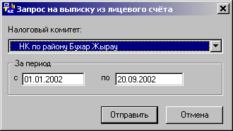 В появившемся окне заполнить требуемые параметры запроса, выбирая значения из раскрывающихся списков (Рисунок12). Правильность вводимой информации – критична. При указании неверных данных вместо ответа на запрос придёт уведомление – «Лицевой счёт отсутствует». Наличие данного кода налога в соответствии с остальными указываемыми в запросе условиями, можно проверить по выписке лицевого счёта (отражает движения/сальдо по всем открытым лицевым счетам). При указании на форме запроса, параметров запрашиваемого лицевого счёта идентичных присутствующим в выписке параметрам для данного счёта (кода налога, код налогового комитета, соответствующий счёту режим налогообложения) – запрос обработается корректно.