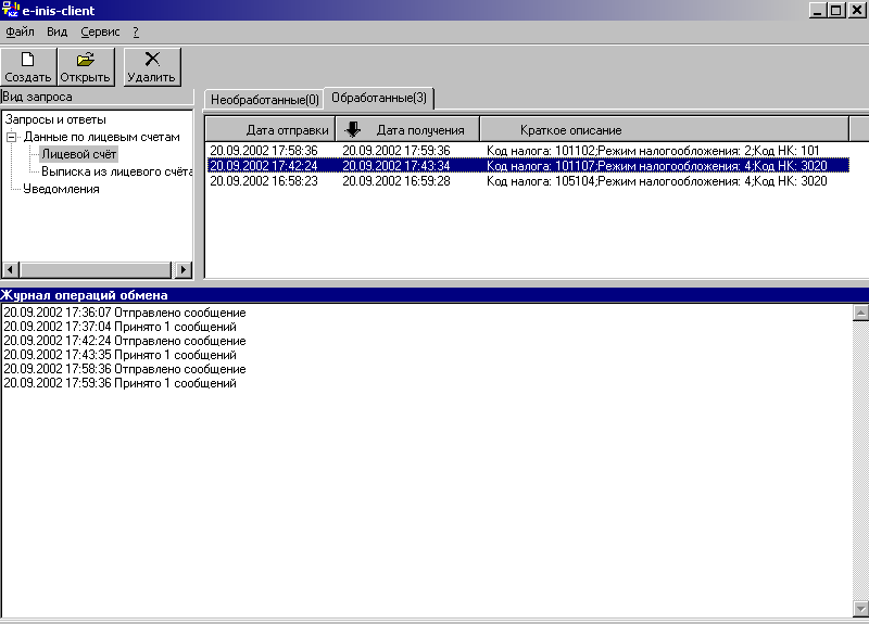 Через несколько (6-25) минут, при нормальной работе серверов в НК, Ваш запрос будет обработан и помещён в очередь. Выбирая пункт «Проверить наличие входящих сообщений» меню «Соединение», либо кнопку «Входящие» панели инструментов – Вы проверяете наличие входящих сообщений с сервера, и если в этот момент в очереди будет присутствовать какое-либо сообщение - оно будет получено клиентским приложением. Приём обработанного запроса сопровождается звуковым сигналом, после чего он появлятся на вкладке “Обработанные” соответствующего режима (Рисунок 9)