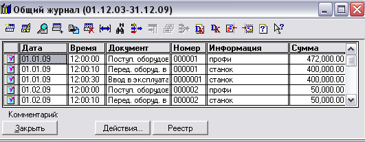 Документы по начислению амортизации, так как являются регламентными, отражаются в журнале проводок, журнале операций и общем журнале.