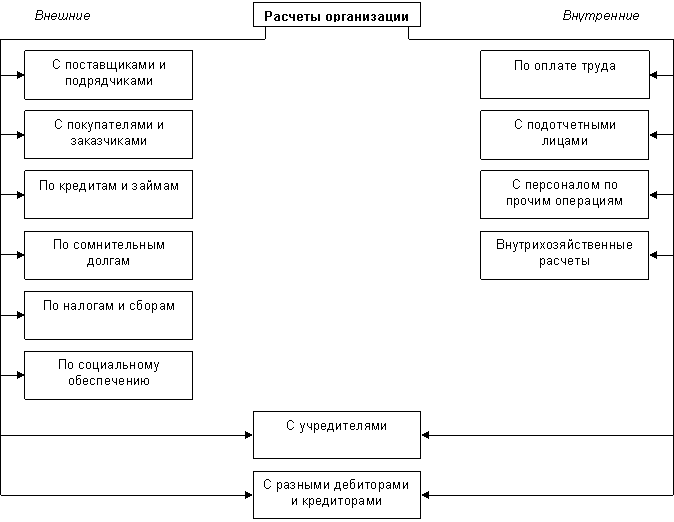 Расчеты с поставщиками и подрядчиками относятся к одному из видов расчетов в зависимости от субъектов участников отношений, возникающих в процессе финансово-хозяйственной деятельности (см. рис. 1).