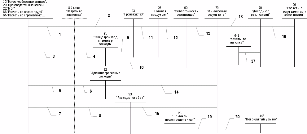 1, 2 – затраты, непосредственно относящиеся на производство продукции, с отражением их по соответствующим экономическим элементам; 3, 4 – общепроизводственные расходы, подлежащие распределению, с отражением их по соответствующим экономическим элементам; 5, 6 – административные расходы, с отражением их по экономическим элементам; 7, 8 – расходы на сбыт, с отражением их по экономическим элементам; 9 – списание распределенных общепроизводственных расходов на затраты производства; 10 – нераспределенные постоянные общепроизводственные расходы включаются в себестоимость реализованной продукции (работ, услуг) в периоде их возникновения; 11 – списываются затраты по произведенной готовой продукции; 12 – отражается себестоимость реализованной продукции; 13 – списывается себестоимость реализованной продукции на финансовые результаты; 14 – списываются административные расходы в периоде их возникновения на финансовые результаты; 15 – списываются расходы на сбыт в периоде их возникновения на финансовые результаты; 16 – отражается доход от реализации на сумму счета, который выставлен покупателю за реализованную продукцию; 17 – исключается из дохода от реализации сумма НДС и отражается как налоговое обязательство; 18 – чистый доход от реализации (без НДС) списывается на финансовые результаты; 19, 20 – определяется финансовый результат прибыль (19) или убыток (20).