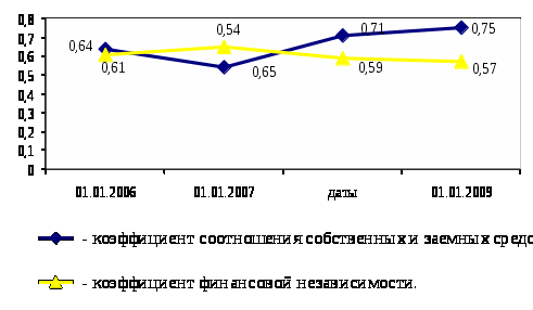 Значения коэффициента финансовой независимости равно 0,59 и 0,57 соответственно, что выше нормы (больше либо равно 0,5), это свидетельствует о надежности и устойчивости организации. Коэффициент соотношения заемных и собственных средств равен 0,71 и 0,75 и показывает, что в течение года произошло уменьшение заемных средств, привлеченных на каждый рубль собственных средств.