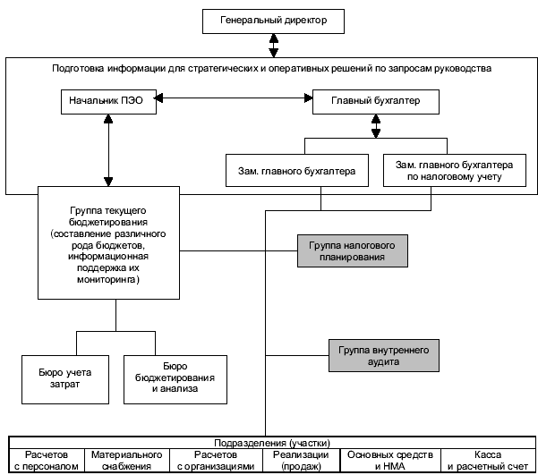 путем включения групп по управленческому учету в состав разных структурных подразделений (бухгалтерии, планового или финансового отдела).