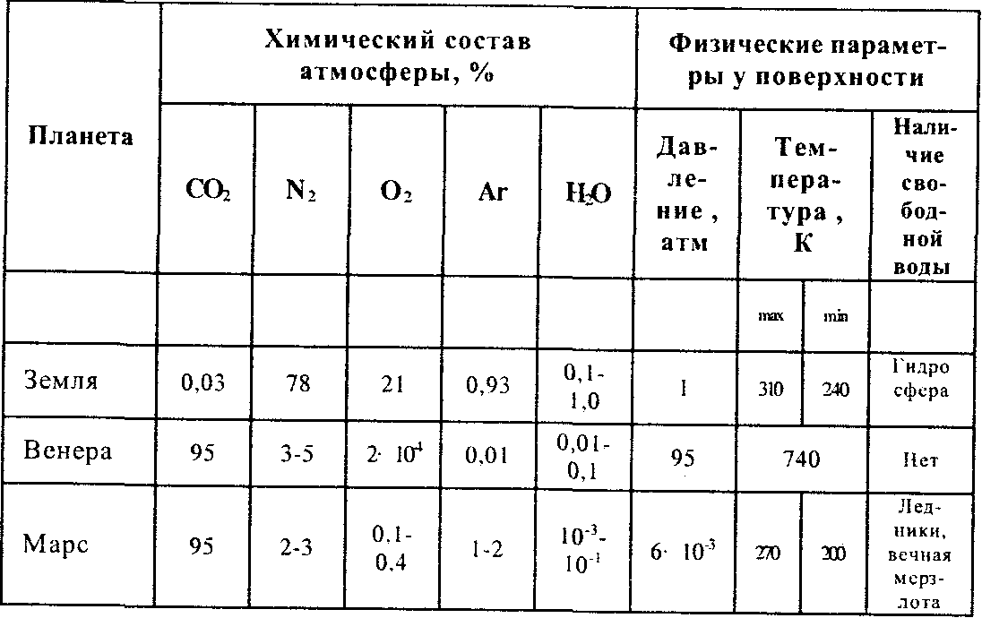 Существенно отличается планеты и составом атмосферы, что видно из табл. 2, где приведен химический состав атмосферы Земли, Венеры и Марса.