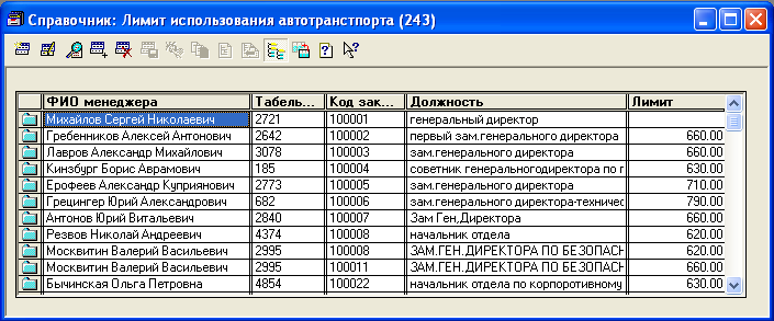 Формирование справочника в электронном виде “Лимит использования автотранспорта” для хранения следующих данных: фамилии, кода заказчика, табельного номера, должности и лимита менеджера. Этот справочник является подчиненным справочнику в электронном виде “Приказы использования автотранспорта”, то есть для каждого элемента справочника “Приказы использования автотранспорта” существует отдельный справочник “Лимит использования автотранспорта” (Модуль ФормирЛимитов).
