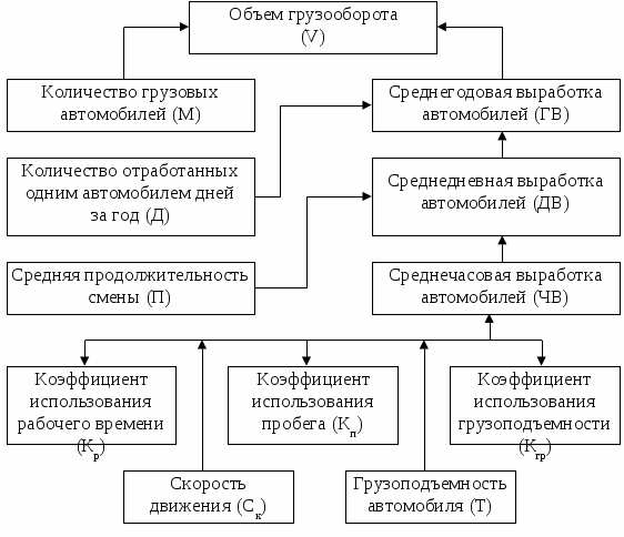Примечания: М - количество машин; Д - количество дней, отработанных одной машиной; П- средняя продолжительность времени смены; К>р> - коэффициент использования рабочего времени; С>к> - скорость движения; К>п> - коэффициент использования пробега; Т - грузоподъемность машины; К>гр> - коэффициент использования грузоподъемности.