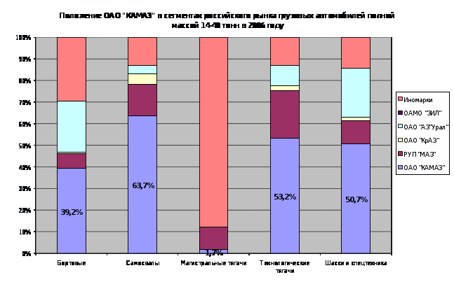 Как видно из представленной ниже диаграммы, несмотря на обостряющуюся конкуренцию, ОАО «КАМАЗ» является лидером во всех сегментах российского рынка грузовых автомобилей полной массой 14-40 тонн. Исключение составляет сегмент магистральных седельных тягачей - здесь КАМАЗ представлен лишь двумя моделями: КАМАЗ-5460 и КАМАЗ-6460.