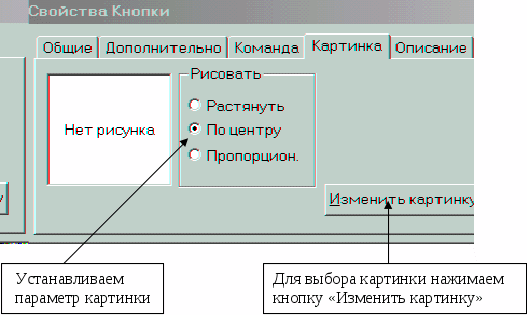 Открываем кнопку «Дубль» или «Сортировка», в зависимости для какой кнопки будем задавать картинку. При открытии кнопки появится окно «Свойство Кнопки», открываем закладку «Картинка», указываем место картинки, путем установления флажка на параметре «По центру». При выборе такого параметра картинка будет располагаться с левой стороны от надписи на кнопке в соответствии с рис.5.28.