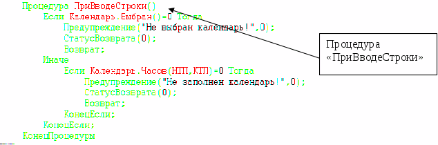Процедура «ПриВводеСтроки» в соответствии с рис.5.32 предусмотрена для того, чтобы контролировать действия пользователя, то есть означает: если пользователь начинает вводить Сотрудника, но при этом ранее не выбрал Календарь, то программа должна сделать предупреждение: «Не выбран календарь!», если же Календарь выбран, но не заполнен, то выходит предупреждение «Не заполнен календарь!». Это необходимо для того, чтобы программа могла посчитать отработанное время согласно календарю предприятия. И пока не будет заполнен и выбран календарь, ввод строки невозможен.