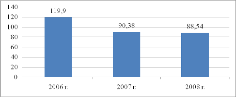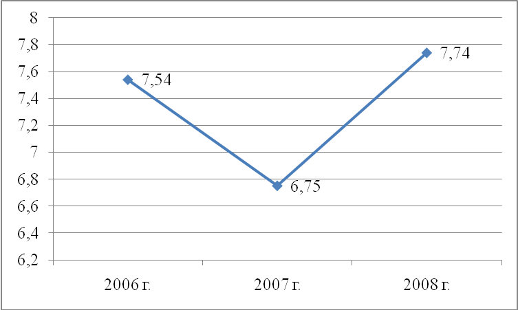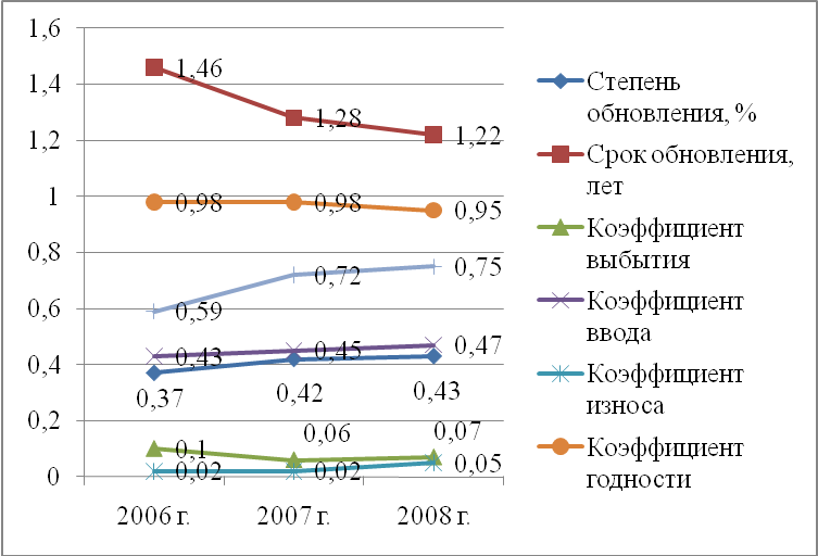 Положительная динамика коэффициента обновления в 2007 и 2008 годах свидетельствует о больших объемах поступления основных средств на баланс предприятия, что является положительной тенденцией, так как данный коэффициент характеризует достаточный уровень обновления фондов для нормальной деятельности рассматриваемого предприятия. Снижение в 2007 и 2008 годах по сравнению с 2006 годом значения коэффициента выбытия говорит о довольно большой доле выбывших основных средств в общей структуре фондов. Это связано с тем, что предприятие продало устаревшее нерентабельное или низкорентабельное оборудование, которое утратило свою актуальность при закупленном новом оборудовании. Снижение срока обновления с 2006 по 2008 годы является положительным сдвигом в структуре движения основных средств. Так, срок обновления основных фондов ООО «Тройка-ресурс» за период с 2006 по 2008 год снизился примерно на 0,24 или на 3 месяца. Коэффициент прироста показывает долю прироста основных средств в стоимости их на начало года. Данные расчетов показывают, что за рассмотренный период этот показатель увеличился с 2006 по 2008 годы с 0,59 до 0,75, что говорит о незначительном, но росте поступлений основных средств за данный период. А в 2007 году данный коэффициент составлял 0,72, что также связано с обновлением основных фондов предприятия в этом периоде. Коэффициент выбытия основных средств в 2008 году по сравнению с 2006 годом имел тенденцию к снижению с 0,10 до 0,07. Данный факт является положительным моментом в сфере управления внеоборотными активами ООО «Тройка-ресурс». При этом присутствует также такой позитивный момент как то, что коэффициент ввода увеличился с 0,43 до 0,47.
