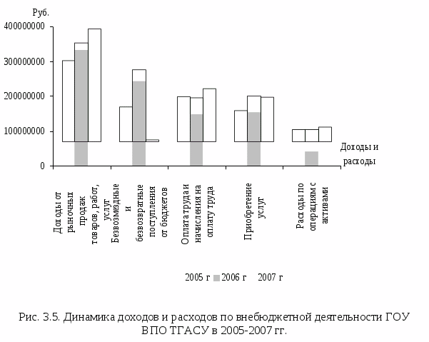 Из полученной таблицы 3.2 и рисунка 3.5 наблюдаются следующие изменения в динамике доходов и расходов по внебюджетной деятельности ГОУ ВПО ТГАСУ: