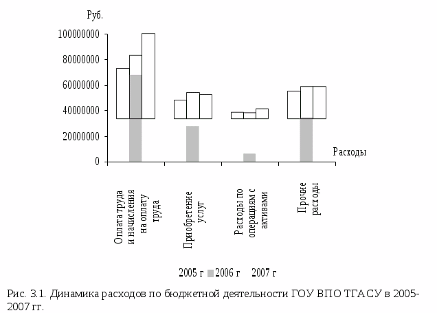 Из полученной таблицы 3.1 и рисунка 3.1 наблюдаются следующие изменения в динамике расходов по бюджетной деятельности ГОУ ВПО ТГАСУ: