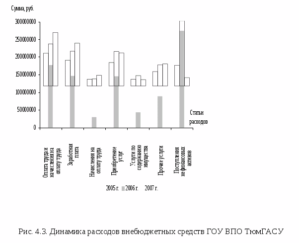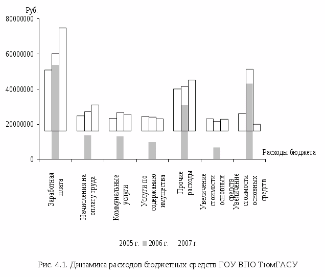 Из полученной таблицы 4.1 и рисунка 4.1 наблюдаются следующая динамика расходов по бюджетной деятельности ГОУ ВПО ТГАСУ в 2005-2007гг.: