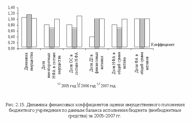 По результатам проведенной оценки имущественного положения в части бюджетных средств (табл.2.3 и рис.2.15) можно сказать, что стабильный финансовый коэффициент в 2005-2007г. занимает доля ОС в составе НФА и доля внеоборотных НФА в составе имущества: в 2005г-0,789; в 2006г. – 0,684, в 2007г. – 0,988.