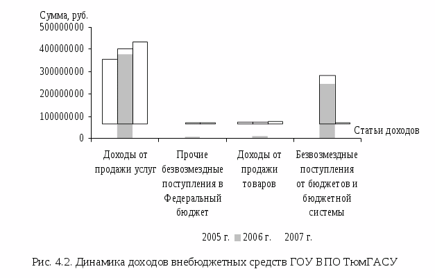 Анализ отчета об исполнении бюджета главного распорядителя (распорядителя), получателя средств бюджета ТюмГАСУ (внебюджетные средства) за 2005-2007 гг. представлен в таблицах 4.3 – 4.5. Динамика доходов бюджетных средств представлена на рисунке 4.2, расходов бюджетных средств – на рисунке 4.3.