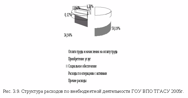 Из полученной таблицы 3.2 и рисунков 3.9-3.11 наблюдаются следующие изменения в структуре расходов по внебюджетной деятельности ГОУ ВПО ТГАСУ в период 2005-2007 гг.: