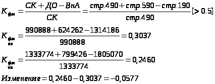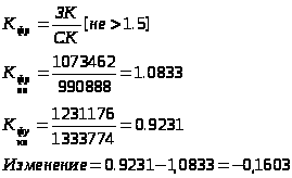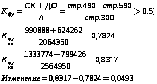 Коэффициент автономии меньше нормы, что свидетельствует о небольшом удельном весе собственных средств в общей сумме источников финансирования. Но увеличение собственного капитала предприятия на 0,10 является положительным фактором и свидетельствует о росте его финансовой устойчивости.