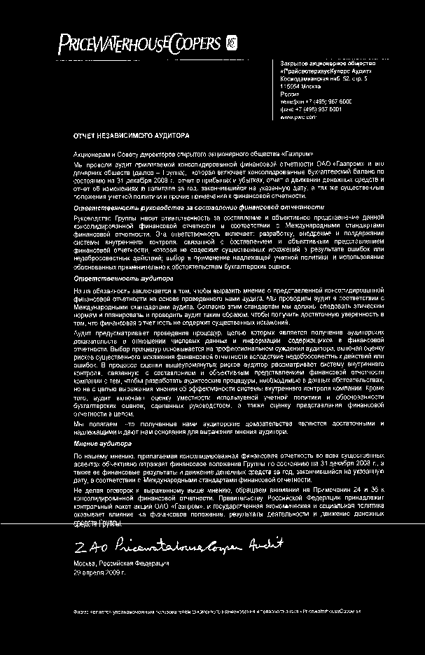 Для целей данной работы приведена отчетность ОАО «Газпром», составленная за 2008 год на основании МСФО. Отчетность была подвергнута аудиту, который осуществлялся аудиторами ЗАО «ПрайсвотерхаусКуперс Аудит», о достоверности и надежности предоставленных данных свидетельствует положительное аудиторское заключение, также представленное в приложениях.