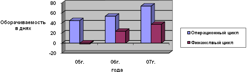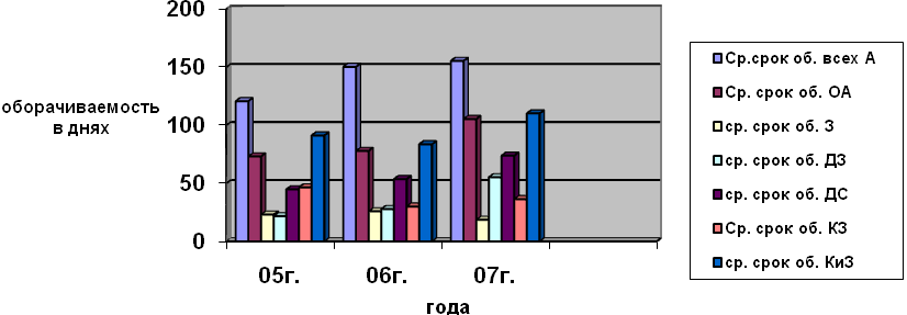 Как показывают данные таблицы 7 и рисунков 13,14 и 15 выросли средний срок оборота всех активов (в 2005 году он составлял 120 дней, в 2006- 150 дней, в 2007- 155 дней), средний срок оборота оборотных активов (2005 год 73 дня, 2006- 77 дней, 2007- 105 дней), средний срок оборота денежных средств (2005год- 44 дня, 2006- 53 и 2007- 74 дня), средний срок оборота дебиторской задолженности (в 2005 год он составлял 21 день, в 2006- 27 дней, в 2007- 55 дней), уменьшились средний срок оборота запасов (по сравнению с 2005 годом на 5 дней) и средний срок кредиторской задолженности (на 10 дней). Операционный и финансовый циклы увеличились (на 29 и 35 дней соответственно), что говорит о спаде деловой активности. Увеличение оборота дебиторской задолженности и денежных средств указывает на затруднение расчетов с дебиторами, а увеличение оборота активов на их неэффективное использование. Таким образом деньги вложенные в активы, превращаются в реальные деньги очень медленно, что отрицательно влияет на финансовое положение предприятия.