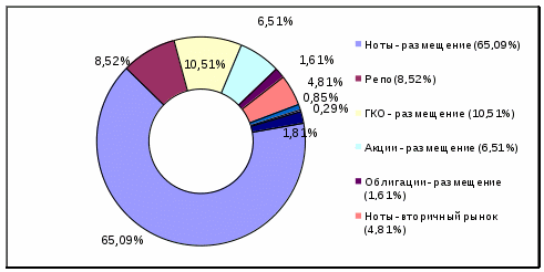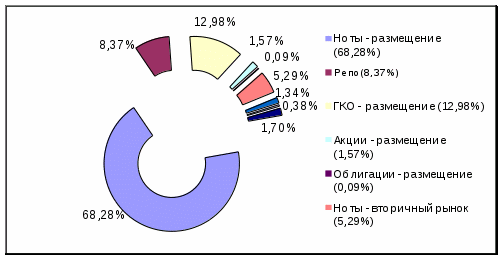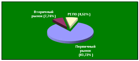 Из указанного объема 111 378 553,08 маната пришлось на долю размещений нот Национального банка, оборот на вторичном рынке по этому инструменту составил 8 231 490,86 маната. Оборот за январь-март 2005 года на первичном рынке нот составил 34 678 413,38 маната, объем сделок на вторичном рынке по этому инструменту составил 1 999 287,20 маната. Объем размещения ГКО Министерства финансов составил за рассматриваемый период 17 979 132,66 маната, в январе-марте прошлого года операции по ГКО не проводились. Оборот по ГКО на вторичном рынке в январе-марте этого года составил 3 099 369,18 маната. Оборот по репо составил в этом году 14 586 649,73 маната (репо-операции в течение января-марта прошлого года проводились на сумму 7 793 014,23 маната).