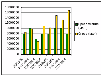 Из указанного объема 68 618 098,58 маната пришлось на долю размещений нот Национального банка, оборот на вторичном рынке по этому инструменту составил 5 315 094,82 маната. Оборот за январь-февраль 2005 года на первичном рынке нот составил 19 845 435,48 маната, объем сделок на вторичном рынке по этому инструменту составил 803 133,60 маната. Объем размещения ГКО Министерства финансов составил за рассматриваемый период 13 048 276,36 маната, в январе-феврале прошлого года операции по ГКО не проводились. Оборот по ГКО на вторичном рынке в январе-феврале этого года составил 1 701 228,08 маната. Оборот по репо составил в этом году 8 408 789,32 маната (репо-операции в течение января-февраля прошлого года проводились на сумму 1 988 785,39 маната). В секторе корпоративных бумаг на долю размещений акций пришлось 1 575 340 манатов (в январе-феврале 2005 года этот показатель составлял 1 856 711 манатов. Оборот на вторичном рынке по акциям составил 1 350 431 манатов (аналог по прошлом году – 598 960,96 маната. Объем размещения корпоративных облигаций за этот период составил 96 562,11 маната, оборот на вторичном рынке облигаций составил 385 388,95 маната (в январе-феврале прошлого года операции по корпоративным облигациям проводились только на вторичном рынке – на сумму в 337 411,03 маната).