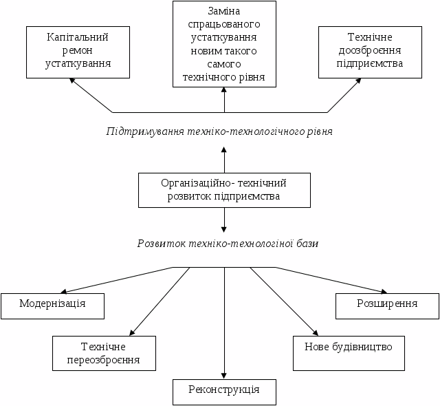 Ці тенденції якісної зміни організаційно-технічної бази виробництва визначають ті основні вимоги, які треба враховувати за формування технічного базису сільськогосподарських підприємств та обґрунтування стратегії його оновлення. Технічний розвиток як об’єкт організаційно-економічного управління охоплює різноманітні форми, які мають відображати відповідні стадії процесу розвитку виробничого потенціалу і забезпечувати просте та розширене відтворення основних фондів підприємства. Із сукупності форм технічного розвитку доцільно виокремлювати такі, що характеризують, з одного боку, підтримування техніко-технологічної бази підприємства, а з іншого – її безпосередній розвиток через удосконалення й нарощування виробництва (рис. 1.1, додаток 1) [8, c. 54].