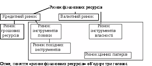 Отже, поняття "ринок фінансових ресурсів" об’єднує три головні складові: кредитний ринок, валютний ринок та ринок цінних паперів. В свою чергу кожна з цих складових, або елементів синтезує в собі певну групу ринкових відносин, що взаємопов’язані в рамках загальної системи.