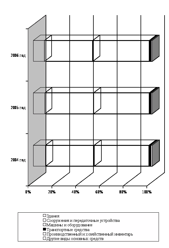 Предприятие располагает большим комплексом заводских помещений, машин и оборудования. Анализируя основные средства на предмет наличия, структуры и движения можно заключить следующее: за анализируемый период наблюдается стабильное увеличение основных средств предприятия. Темп роста в 2005 году составил 106%. В 2006 году темп роста составил 122% относительно базового 2004 года. Анализ структуры основных средств предприятия ОАО «АвтоВАЗагрегат» позволяет сделать вывод о стабильности структуры основных средств за ряд анализируемых лет с 2004 по 2006 год. Наибольший удельный вес в общей структуре основных средств предприятия занимают сооружения и передаточные устройства -более 40% и машины и оборудование –более 46%. Около 10% в общей структуре –это здания. Транспортные средства предприятия составляют немногим меньше 2%. Незначительная часть в общей структуре основных средств составляют производственный и хозяйственный инвентарь и другие виды основных средств. За истекший период доля активной части основных средств практически не изменилась и составила 48,65% на начало периода и 49,27% на конец анализируемого периода. Коэффициент износа за анализируемый период повысился с 38% до 39%, т.е. Темп роста составил 103%. Как в 2005 , так и в 2006 году предприятие планомерно обновляет 13% основных средств. Если эта тенденция сохранится, то основные средства будут полностью обновлены через 2,33 года. Выбытие основных средств происходило пропорционально их обновлению. К концу года выбыло 15% имеющихся основных средств, при этом обновилось 13% основных средств, поэтому коэффициент прироста составляет 12%. Это говорит о том, что предприятие за истекший период накопило основные средства.