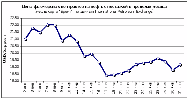 В первую очередь дальнейшему росту препятствует падение мировых цен на нефть. В первой половине месяца стоимость нефти сорта “брент” снижалась быстрыми темпами и перескочила за отметку 18,5 долл. за баррель. Одной из причин этого спада стал рост товарных запасов нефти в США – одного из главных мировых потребителей сырья. В середине месяца стало известно, что снижение квот на добычу нефти предпринятое ОПЕК в конце прошлого года – не окончательное, и может последовать дальнейшее снижение квот картелем. Под влиянием этой новости падение цен остановилось, и наметился небольшой рост. В результате стоимость фьючерсного контракта на нефть марки “Brent” с поставкой в пределах месяца на Лондонской бирже упала за месяц на 4% и составила 31 января 19,18 долл. США за баррель.
