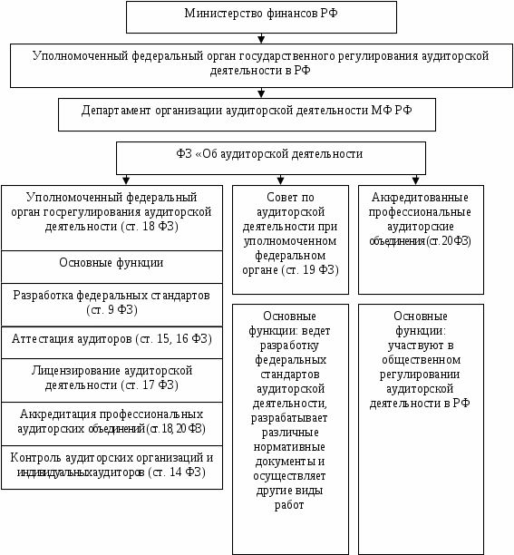 Три статьи закона посвящены вопросам управления аудиторской деятельностью, включая описание Уполномоченного федерального органа государственного регулирования аудиторской деятельности, Совета по аудиторской деятельности при Уполномоченном федеральном органе и аккредитованных профессиональных аудиторских объединений (организационно-правовая структура аудиторской деятельности в Российской Федерации приведена на рис.1).