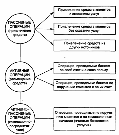 пассивные операции (привлечение средств); активные операции (размещение средств); активно-пассивные (посреднические, трастовые и пр.) операции |