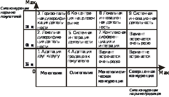- сущность миссии и стратегии организации: силовая (виолентная), нишевая (патиентная), приспособленческая (коммутантная), пионерская (эксплерентная);