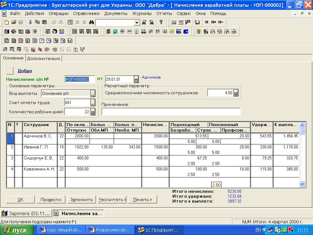 Перейдемо до заповнення табличної частини. Її можна заповнювати рядок за рядком (клавішею Insert), але краще скористатися кнопкою «Заповнити». У табличну частину буде перенесений список співробітників. Графа «Дн.» таблиці заповниться значенням реквізиту «Кількість робочих днів» з шапки документа, а графа «По окладу» — значеннями реквізиту «Оклад» з довідника «Співробітники». Якщо тепер в осередок «Дн.» ввести кількість реально відпрацьованих днів, нарахована співробітникові зарплата буде перерахована (рис. 6.2).