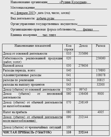 По строке прибыль убыток за период отражается сумма финансового результата предприятия 232144 тенге, рассчитанная следующим образом: из суммы всех доходов предприятия вычитается сумма всех расходов.