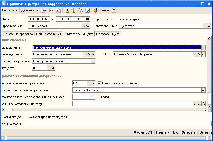 Например, в регистре сведений “Местонахождение ОС (бухгалтерский учет)” хранится история местонахождения объектов ОС. Сведения об инвентарном номере объекта, способе его поступления в организацию, порядке погашения стоимости, принятом способе начисления амортизации и о первоначальной стоимости для целей бухг.учета хранятся в регистре “Первоначальные сведения ОС (налог. учет)” При проведении документа в этих регистрах производится запись для объекта основных средств.12