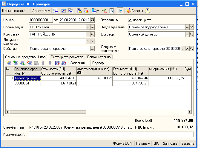 При проведении документ, кроме отражения операции на счетах бухгалтерского и налогового учета, производит движения в различных регистрах. Связано это с тем, что большая часть информации об объекте ОС хранится не в справочнике “Основные средства”, а в регистрах сведений.