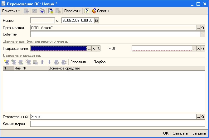 В поле “Событие” из справочника “События с основными средствами” выбираем элемент внутреннее перемещение.