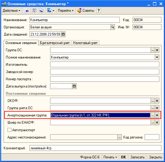 Амортизационная группа ОС - следует выбрать категорию, к которой относится данное основное средство.