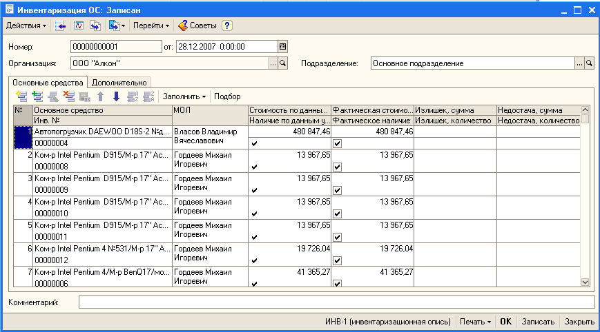 В целях обеспечения достоверности данных бухгалтерского учета и отчетности один раз в три года проводится инвентаризация основных средств. Кроме того, ее проведение необходимо при смене материально ответственных лиц, после стихийных бедствий и при ликвидации организации. Инвентаризация ОС включает в первую очередь проверку наличия документального оформления. Для оформления результатов инвентаризации в программе предназначен документ «Инвентаризация ОС» Рис.33