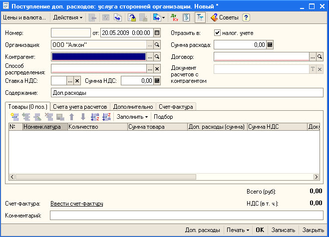 На закладке “бухгалтерский учет” указывается счет бухгалтерского учета и счет налогового учета (при установленном флажке “Отражать в налоговом учете”), на который необходимо списать сумму понесенных расходов.