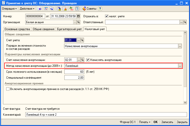 На закладке Налог на прибыль добавлен реквизит Метод начисления амортизации (с 2009 г.), в котором хранится применяемый организацией метод начисления амортизации. Этот реквизит подлежит обязательному заполнению! (см. рис. 1).