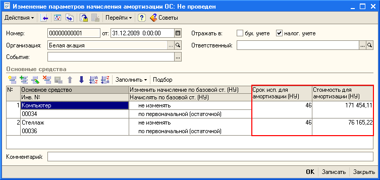 Если организация приняла решение перейти в 2009 году на нелинейный метод, в программу необходимо ввести следующие данные по амортизируемым основным средствам: