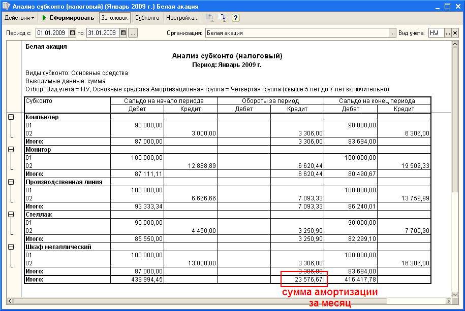 Рассмотрим анализ амортизационной группы на примере отчета Анализ субконто (налоговый) (см. рис. 4).