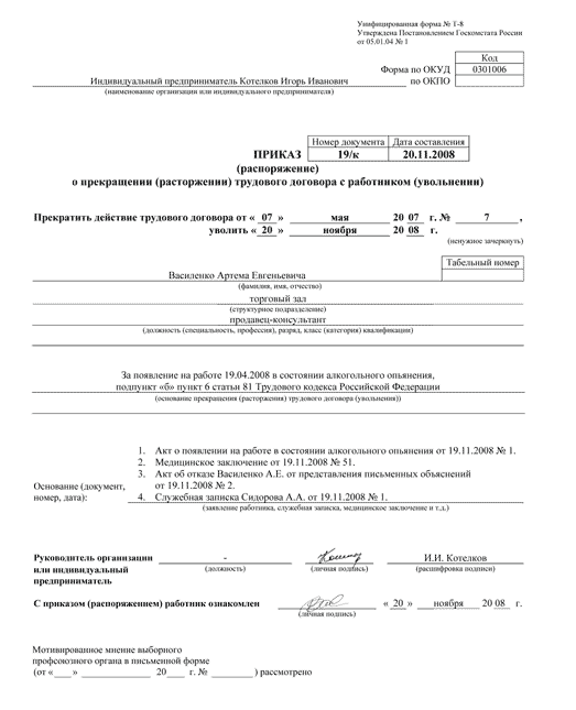 Пример: на основании акта о появлении на работе в состоянии алкогольного опьянения от 19.11.2008г №1, медицинского заключения от 19.11.2008г №51 и служебной записки Сидорова А.А. от 19.11.2008г №1 составить приказ о прекращении трудового договора с Василенко Артемом Евгеньевичем за появление на работе 19.04.2008г в состоянии алкогольного опьянения. (см. приложение 4).