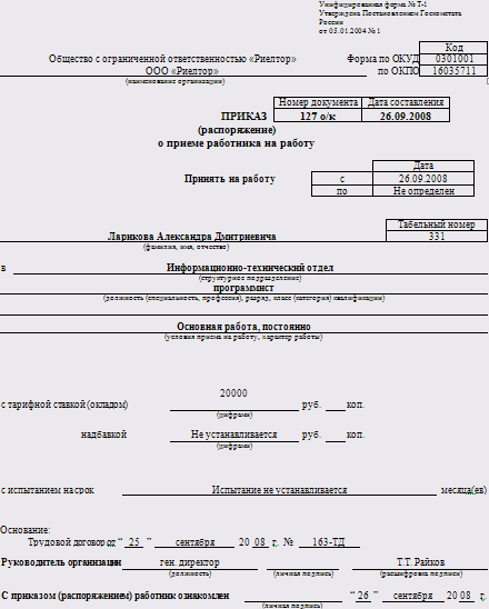 Так, например, принятие на должность программиста Ларикова Александра Дмитриевича в ООО "Риелтор" оформляется также согласно типовой форме №Т-1 (см. приложение 1).