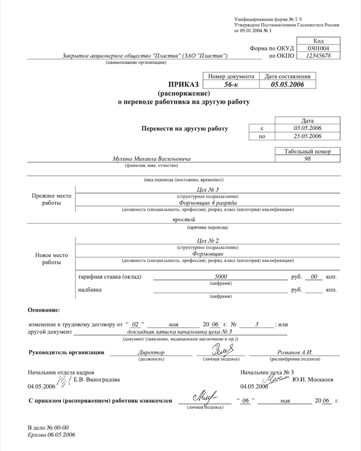Приказ (распоряжение) о переводе работника на другую работу (форма №Т-5) и приказ (распоряжение) о переводе работников на другую работу (форма №Т-5а) используются для оформления и учета перевода работников на другую работу в организации. Заполняются работником кадровой службы с учетом письменного согласия работника, подписываются руководителем организации или уполномоченным им лицом, объявляются работнику под расписку. На основании данного приказа делаются отметки в личной карточке, лицевом счете, вносится запись в трудовую книжку. Пример заполнения формы №Т-5 приведен в приложении (см. приложение 9).