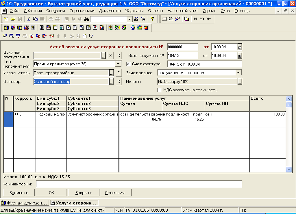 Назначение работы: ознакомление с основными возможностями программы и ее использованием в практической работе бухгалтера.