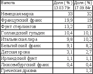 На момент учреждения ЭКЮ и при первом значительном изменении весов корзины 17 сентября 1984г. Доли разных валют в ней составили: