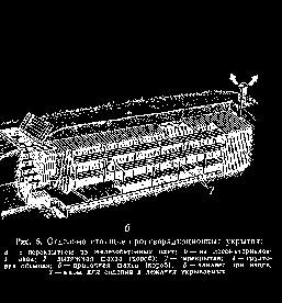 жердей диаметром 5-7 см; их плотно подгоняют друг к другу и цепляют с помощью двух (вверху и внизу) поперечных планок. Можно использовать, кроме того, маты из тонких жердей или лучков хвороста, связанных между собой проволокой. Для подвешивания мата в верхней части его привязывается жердь длиной 2-2,2 м; жердь привязывают к оттяжкам из проволоки закрепленными анкерными кольцами.